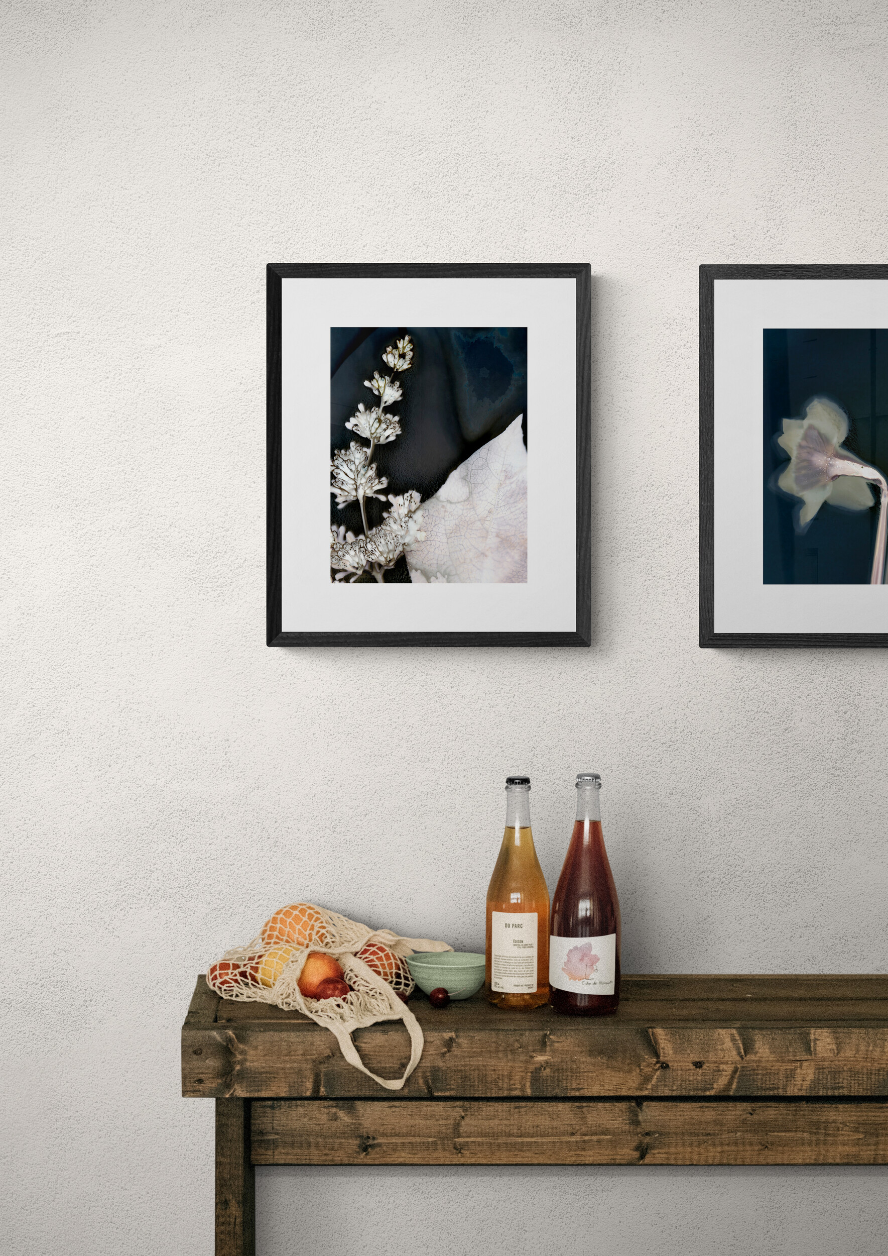 The work presented begins with the research and collection of plants found in my environment, that is to say flowers and plants that I expose in the sun on expired argentic photo paper. Not being fixed by any chemical process, the photograms disappear. Before their disappearance and to preserve the imprint, the argentic photo paper is digitized. The virtual images thus created are refined using digital tools. This artistic process reveals the complex process of plant decomposition while addressing its metamorphic power. It is also a testament to the cyclical nature of everything, as illustrated by the withering and dying plant on photographic paper.